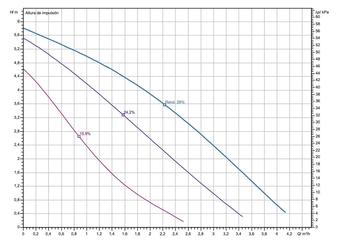 • Flujo constante de agua limpia con un caudal nominal de 50 L/min (0.83 l/s), rango de flujo entre 20-85 L/min (0.33-1.42 l/s), y presión útil entre 10-60 metros de columna de agua (mca).