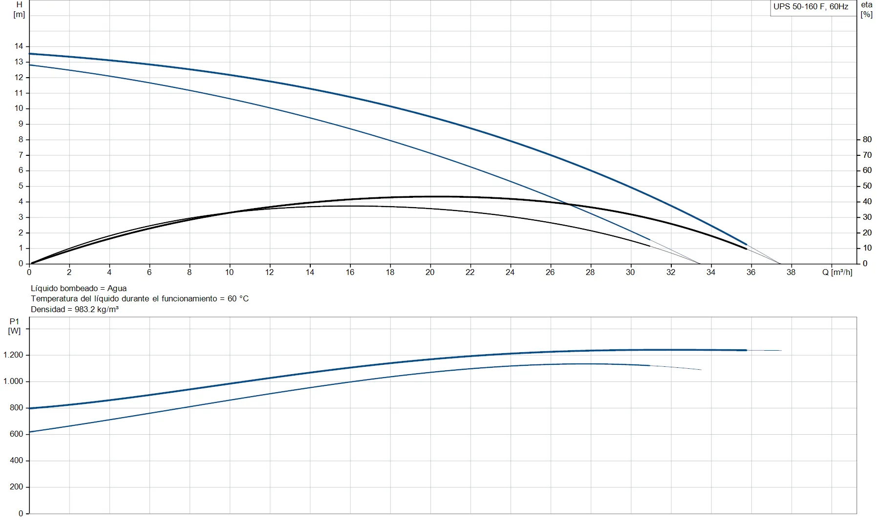 LíquidoLíquido bombeado: Agua Rango de temperatura del líquido: -10 .. 120 °C Temperatura del líquido durante el funcionamiento: 60 °C Densidad: 983.2 kg/m³ TécnicoHomologaciones: CCSAUS MaterialesCuerpo hidráulico: Fundición Carcasa de la bomba: EN 1561 EN-GJL-250 ASTM 35 B – 40 B Impulsor: Acero inoxidable EN 1.4301 AISI 304 InstalaciónRango de temperaturas ambientales: 0 .. 40 °C Presión de trabajo máxima: 10 bar Normativa de conexión de tubería: USA Tipo de conexión: DIN Conexión de tubería: GF 50 Presión nominal para la conexión: PN 10 Longitud puerto a puerto: 355 mm | Datos eléctricosPotencia de entrada en velocidad 1: 950 W Potencia de entrada en velocidad 2: 1000 W Potencia de entrada máx.: 1300 W Frecuencia de red: 60 Hz Tensión nominal: 3 x 460 V Intensidad en velocidad 1: 2.75 A Intensidad en velocidad 2: 1.5 A Corriente en velocidad 3: 2 A Cos phi a velocidad 1: 0.87 Cos phi a velocidad 2: 0.84 Cos phi: 0.82 Tamaño condensador – Funcionamiento: 16 µF/400 V Grado de protección (IEC 34-5): X4D Clase de aislamiento (IEC 85): H Protección estándar Ex: CONTACT Resistencia de los bobinados: 24.2 – 31.5 Ohm Paneles controlRelay: sin relé |