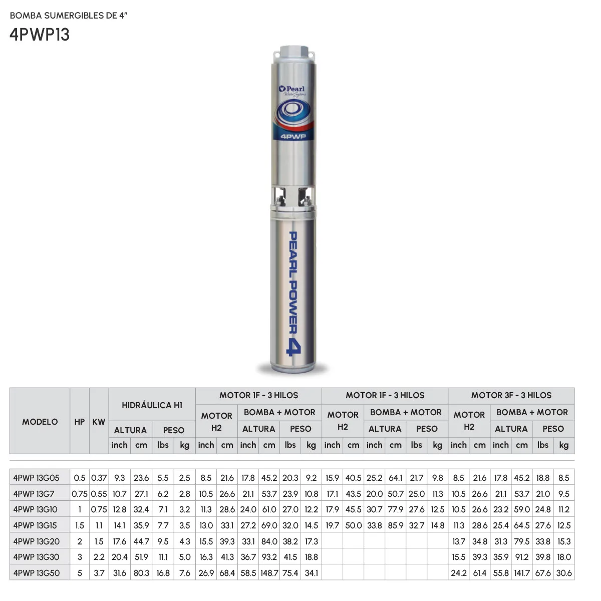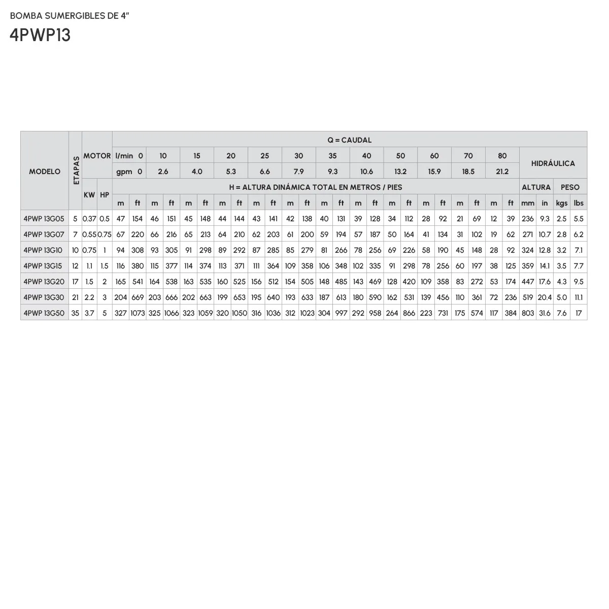 | 4PWP05G 05H | 0,5 | 12 | 1.1/4″ | Nema 4″ | Flotante | 114 | 8 |