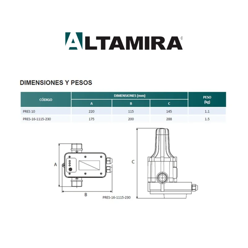 Controlador Altamira PRES-16-1115-230. Este kit de control es ideal para el ensamble de sistemas de presión compactos y de operación automática, ya que no requiere tanque precargado, switch de presión ni componentes adicionales.